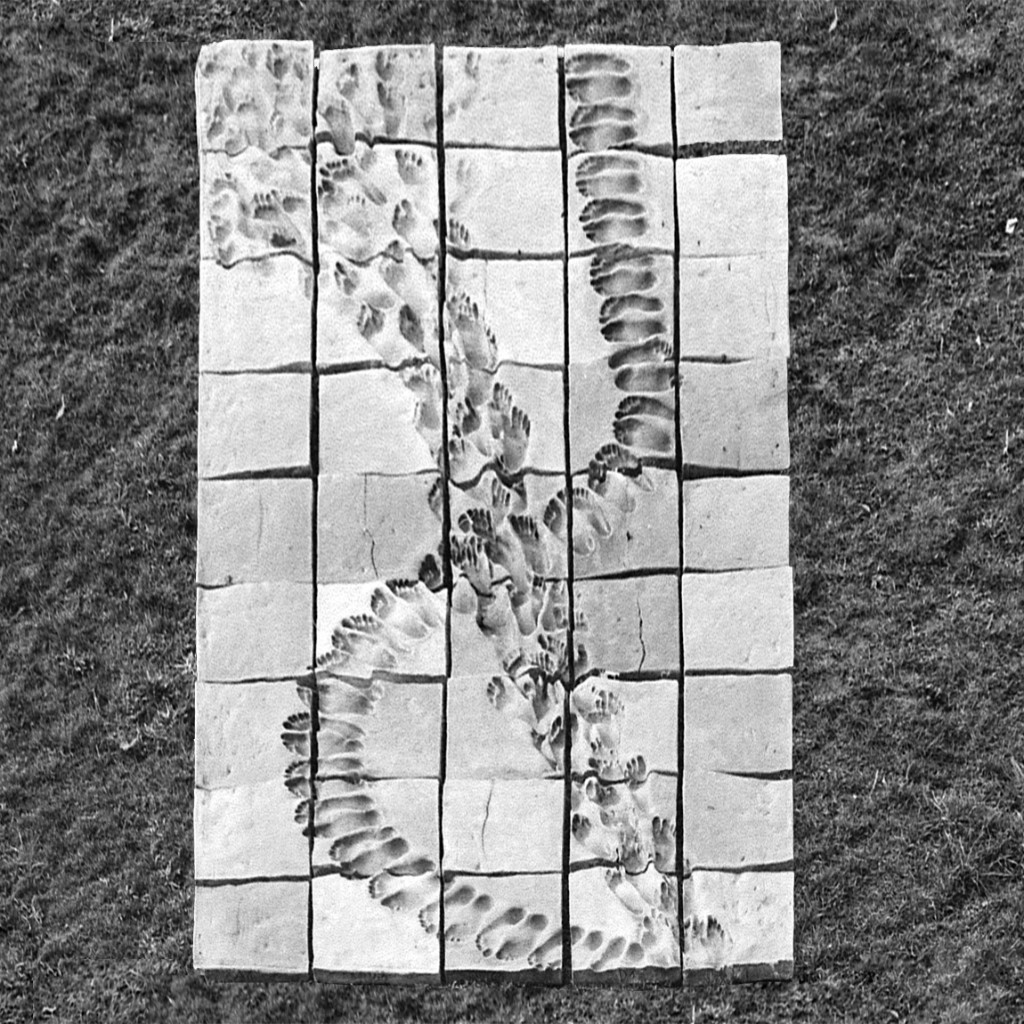 - Das Ergebnis der Auseinandersetzung wird in 60 x 60 cm große quadratische Platten zerteilt und den handwerklichen Notwendigkeiten entsprechend zu einem fertigen Werk weiterverarbeitet.