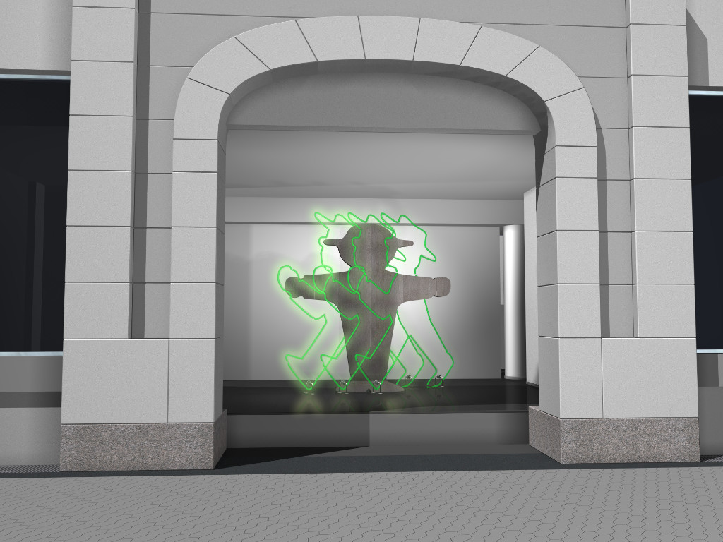 Die Formgestalt des „Ampelmännchen“ liegt der Skulptur direkt und unverstellt zugrunde. Es hat sich als ein Zeichen für die ehemalige DDR etabliert.
