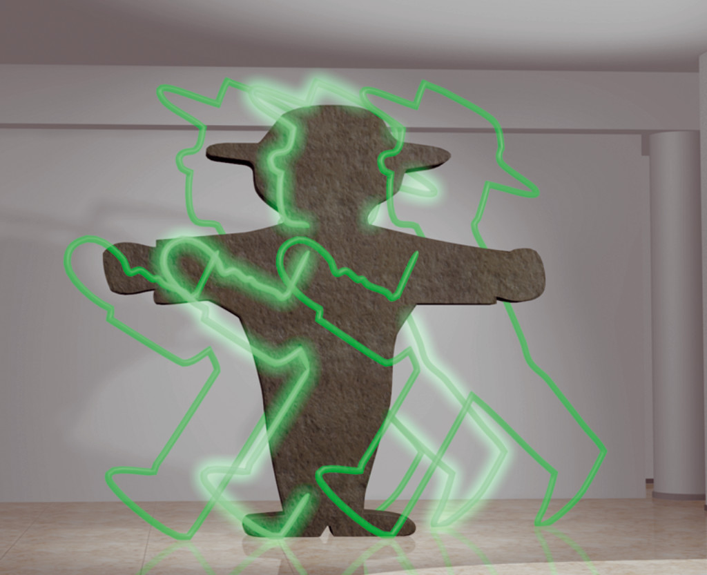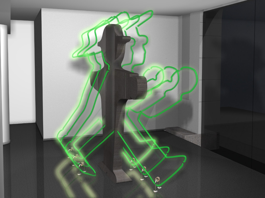 Der Gesamteindruck der Skulptur ist einfach und prägnant. Der gegensätzliche Materialcharakter des rauen Betons sowie der des leichten, leuchtenden, beweglichen Lichtträgers spiegelt sich unmittelbar in der Zeichenbedeutung wieder. Es formt sich die Chiffre einer menschlichen Figur, die sich durch Barrieren nicht auf Dauer in ihrer Bewegungsfreiheit einschränken lässt.