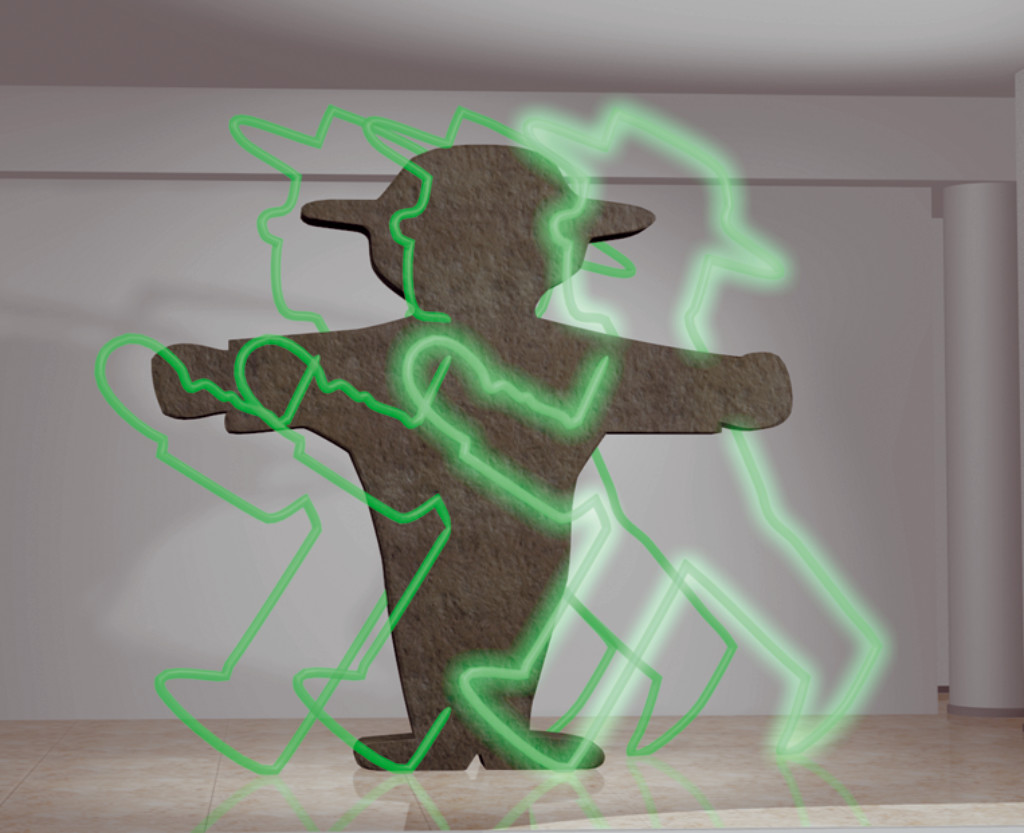 Die Leuchtstoffröhren-Figuren durchdringen den Beton – und scheinen den Beton zu durchschreiten.