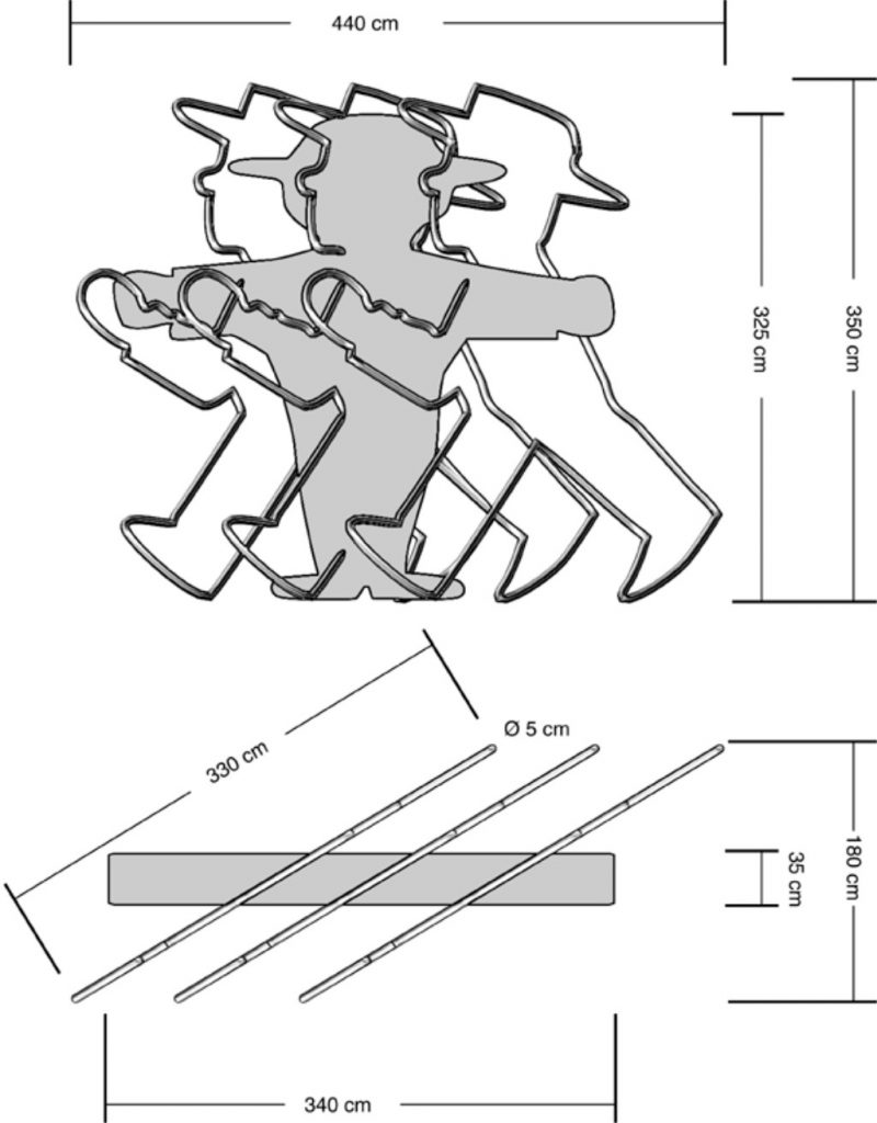 Die Skulptur hat eine Gesamtabmessung von ca. 350 x 440 x 180 cm (H x B x T)