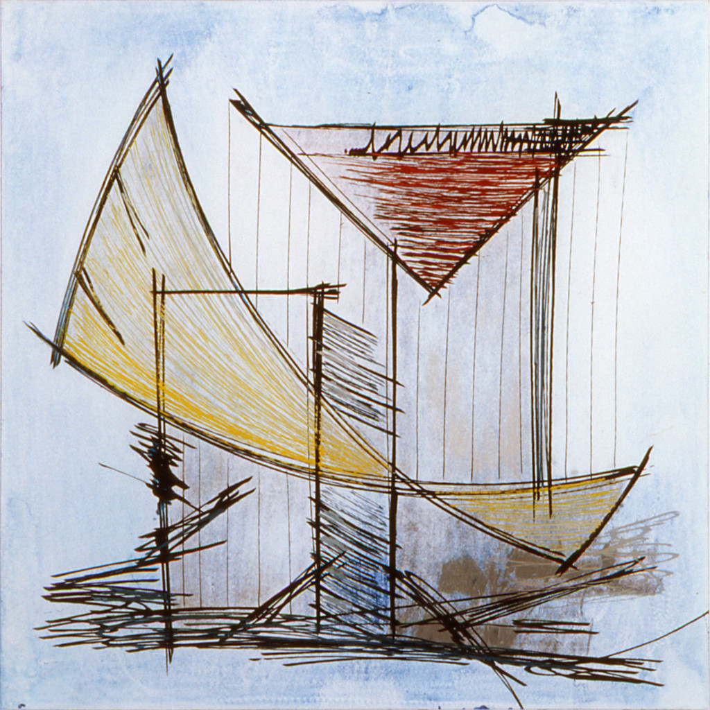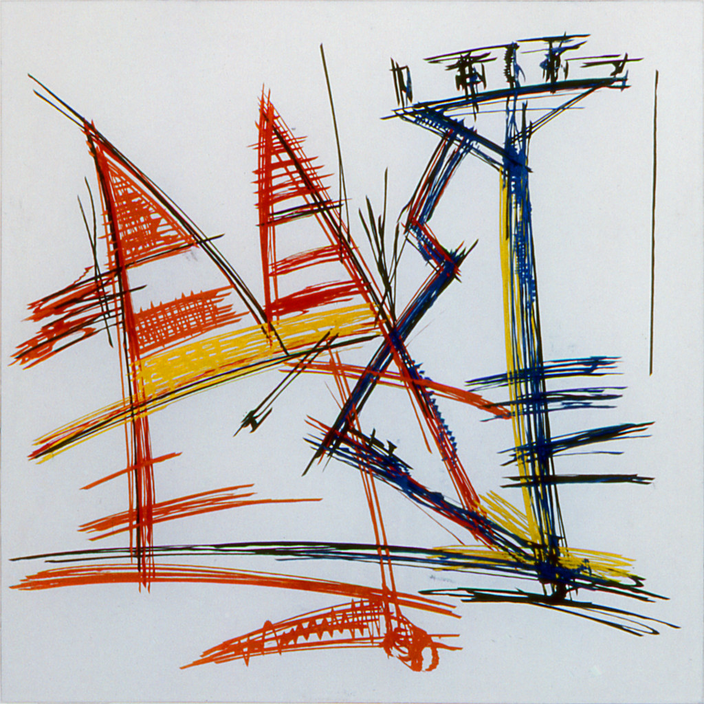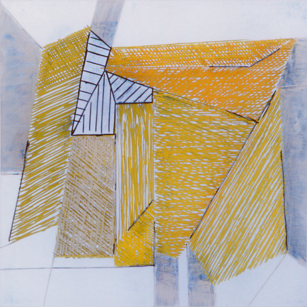 Bei diesen Bildplatten entsteht die Form oder die Bildzeichen in dem die Linien aus dem Körper entfernt werden. Als Zeichenstift wurde hier ein Kreissäge verwendet, dadurch gräbt sich der Strich in die Acrylglasplatte ein und die zweidimensionale Linie gewinnt körperliche Dimensionen. Über- und untereinander gelegte Striche zeigen bei gerichteter Beleuchtung durch den entstehenden Schattenwurf Raumtiefe im Bild.