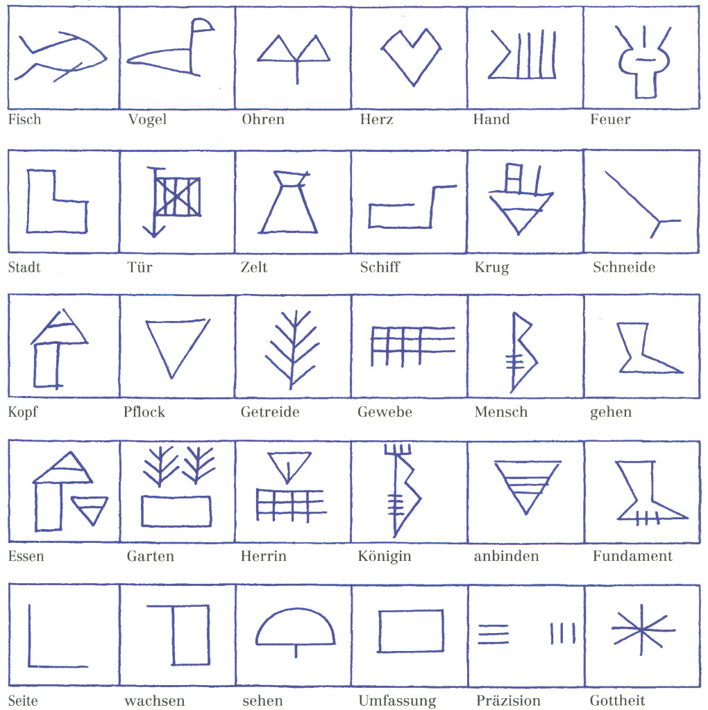 Darstellung einiger Elemente der Bilderschrift der Sumerer (entspr. G.A.Barton und E.Unger Leipzig 1929) nach Adrian Frutiger – „Der Mensch und seine Zeichen“ ISBN 3-925037-39-X