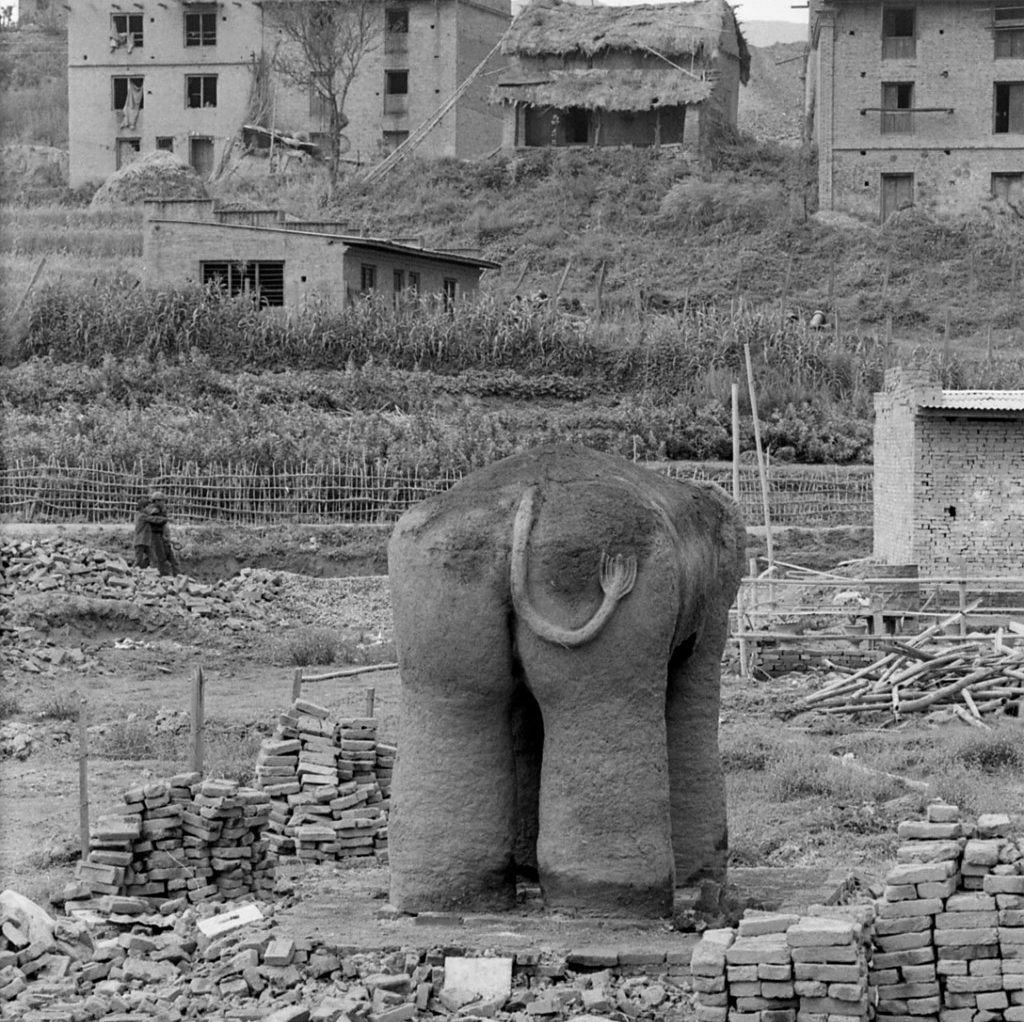 Zur Stabilisierung beim Bau der Plastik wurde das Volumen des Elefanten mit Stroh um ein Bambusgerüst aufgefüllt. Beim Brand ist dies einfach ein klein wenig zusätzlicher Brennstoff.