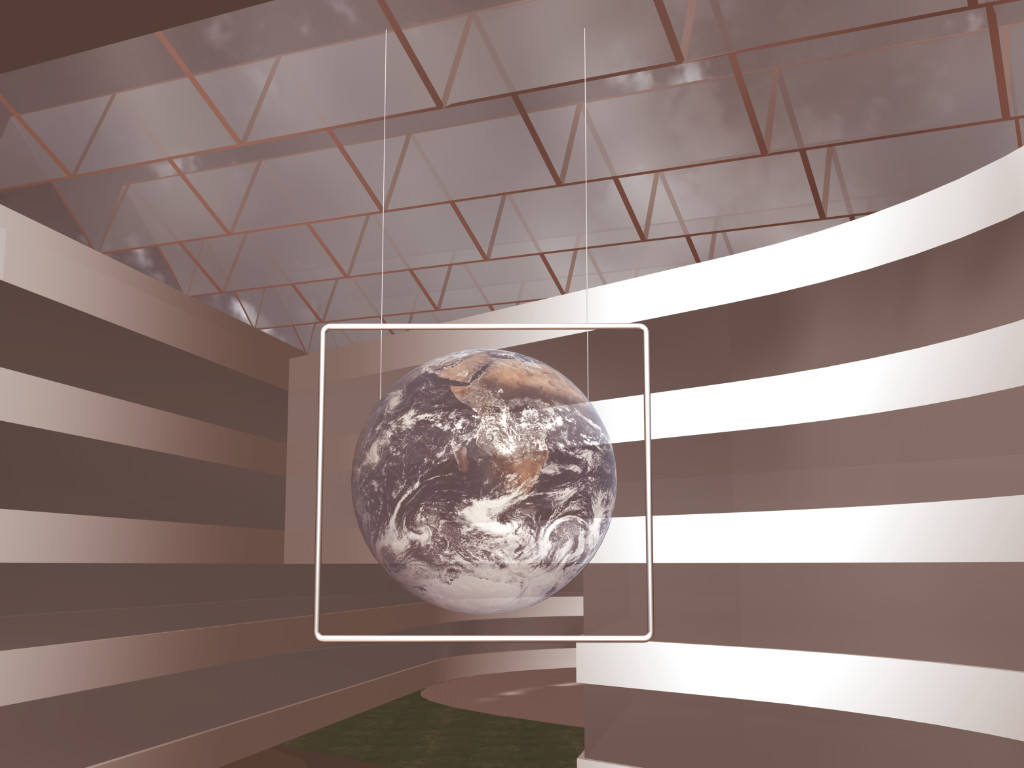 Diese Skulptur zeigt die Erde, also den „Verhandlungsgegenstand“ des Umweltbundesamtes in seiner größten und aktuellsten Form. Die Schönheit des Planeten zeigt sich zu jedem Zeitpunkt als konkreter Hinweis auf die Verantwortung des Umweltbundesamtes. – Verliert dieses Ding nicht aus den Augen! –