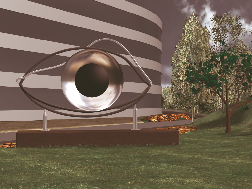 Auf einem flachen Sockel aus schwarzem Granit wird der Betrachter mit einer großen Augenform konfrontiert.