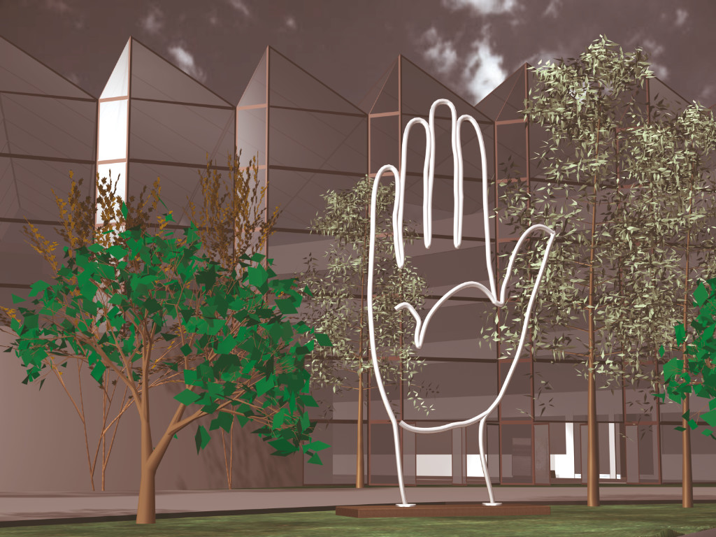 Das Zeichen steht auf einem niedrigen Sockel aus schwarzem Granit. Die Konturlinie der Hand wird aus gebürstetem Edelstahlrohr gebogen und geschweißt.