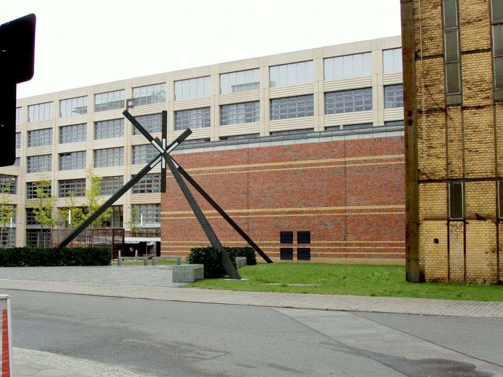 Im Raum wird ein Ort durch drei sich kreuzenden Linien eindeutig beschrieben. In dieser Weise wird die räumliche Mitte dieses kleinen Gebietes gekennzeichnet. In einer Übertragung aus der Welt der Pläne wird hier in der realen Welt ein Ort festgelegt. Drei zueinander rechtwinklig angelegte Stahlstäbe kreuzen sich an dem definierten Ort im Raum über dem Platz. Diese Mitte ist durch einen ergänzenden, kurzen vertikalen Stab im Kreuzungspunkt der Träger visuell nach unten auf den Grund projiziert.