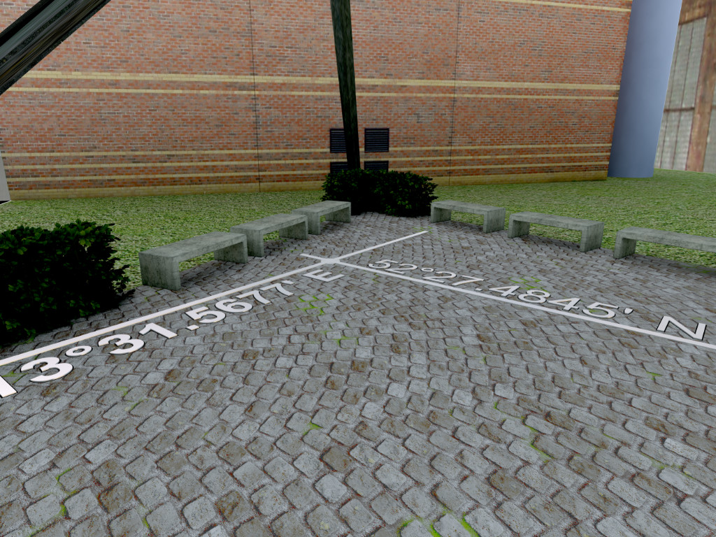 Neben der faktischen, räumlichen Kennzeichnung des Ortes wird im Pflaster unter dem Raumkreuz die genaue Weltkoordinate auf den Grund geschrieben. Einerseits begegnen sich hier die theoretische Beschreibungen eines Ortes mit der faktischen Kennzeichnung des Platzes, andererseits ist es ein starker Verweis darauf ein Teil der Welt zu sein.