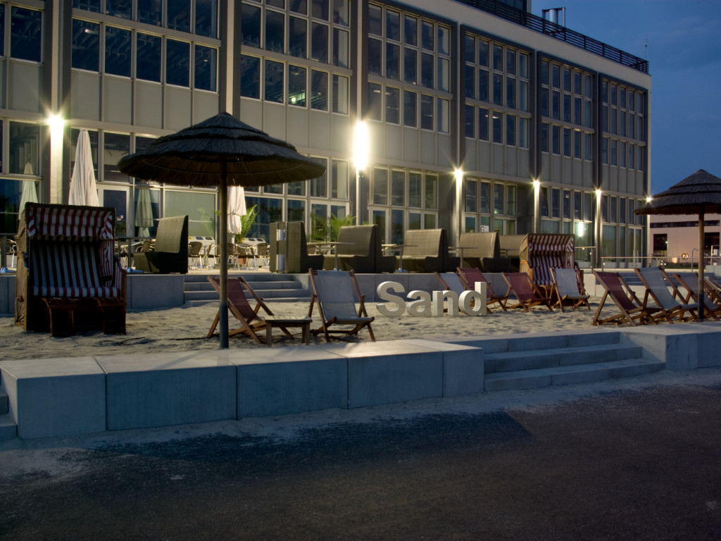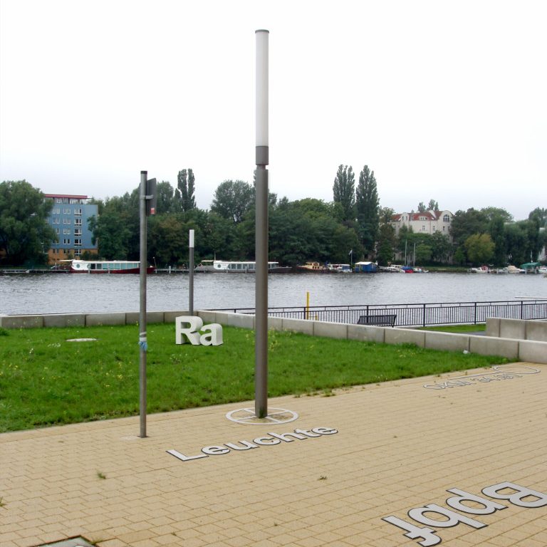 Im Sand vor der Mensa steht groß und deutlich Sand. Der Schriftzug „Auslaufbauwerk“ kennzeichnet schlicht ein Auslaufbauwerk. So wichtig dies für einen Planer ist sowenig lässt es sich in der Wirklichkeit erkennen. Die Leuchte wird durch Wort, Symbol und eben durch sich selbst erkennbar. Die Baumscheiben und ähnliche Artefakte werden für den flüchtigen Betrachter Teile einer fremden Welt bleiben.