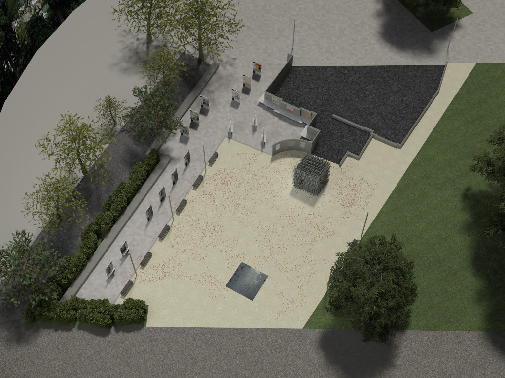 entfaltet sich entlang der gesamten Länge der Geländegrenze zum Matterngarten. In gleicher axialer Richtung wie der Gedenkstrang werden die relevanten Fragestellungen präsentiert. Die Opfer und ihre Geschichte, der Widerstand und der Prozess Aufarbeitung der nationalsozialistischen Verbrechen nach dem Krieg werden in paralleler Lage zur Bezugslinie Gedenkplatte – Skulptur gezeigt. (…)