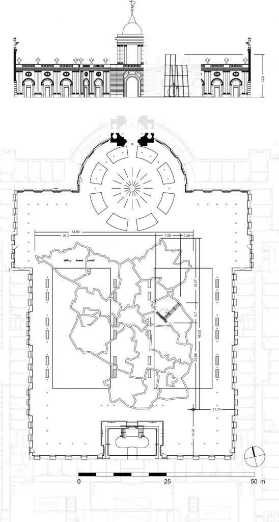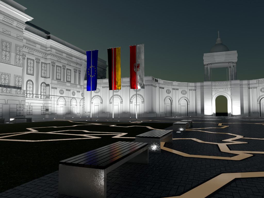 Diese beiden Formsprachen können sich überlagern ohne sich zu stören. Konkret bedeutet dies, dass die vorgesehene Hofgestaltung mit den beiden Rasenflächen und der Belag des Hofes unverändert realisiert werden, andererseits aber soll die feine Konturlinie Brandenburgs sich nicht an diesen Begrenzungen orientieren, sondern der gesamten Innenhof nutzen