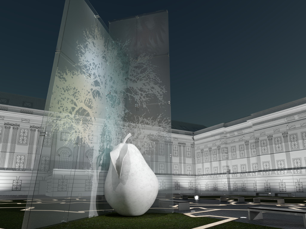 Das Bild des Birnbaumes und der Frucht kann als ein komprimiertes Symbol für diese Grundwerte gelesen werden. Die Konturlinie Brandenburgs mit allen Regionen benennt das Gebiet in dem diese Grundwerte gelten. Die Rekonstruktion des Stadtschlosses in Potsdam, nicht nur in seiner architektonischen Dimension, sondern auch durch die applizierte Fassade prägt den Innenhof des zukünftigen Parlamentsgebäudes durch Farbe und Form im Sinne einer vergangenen Epoche.