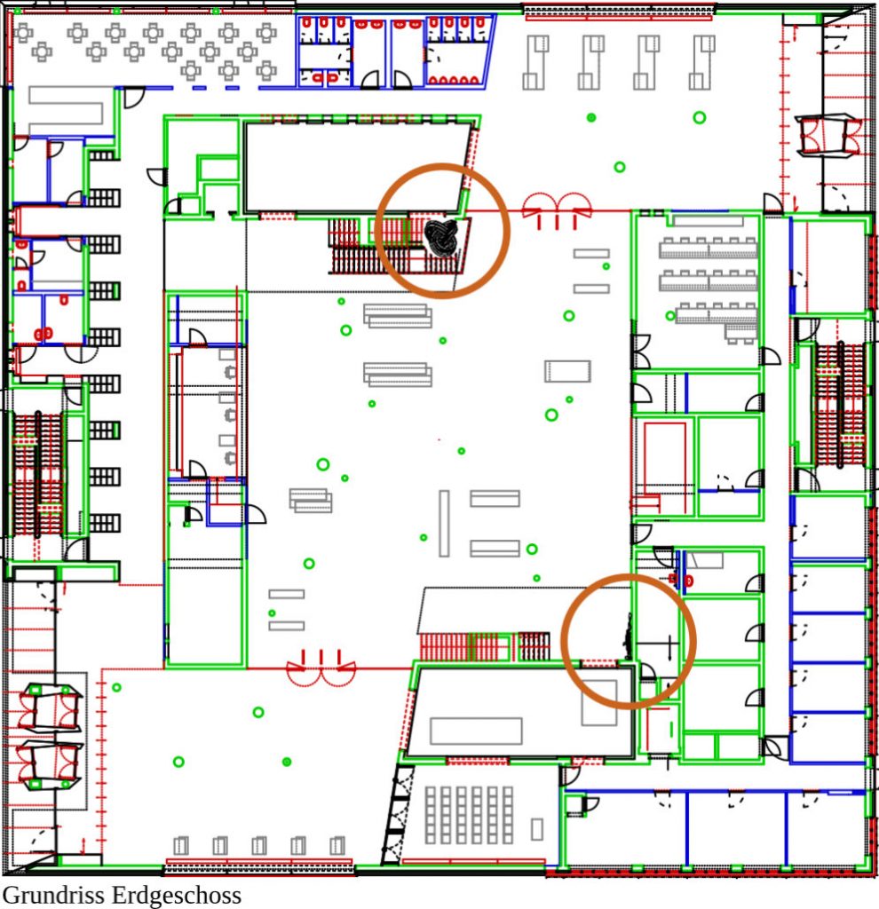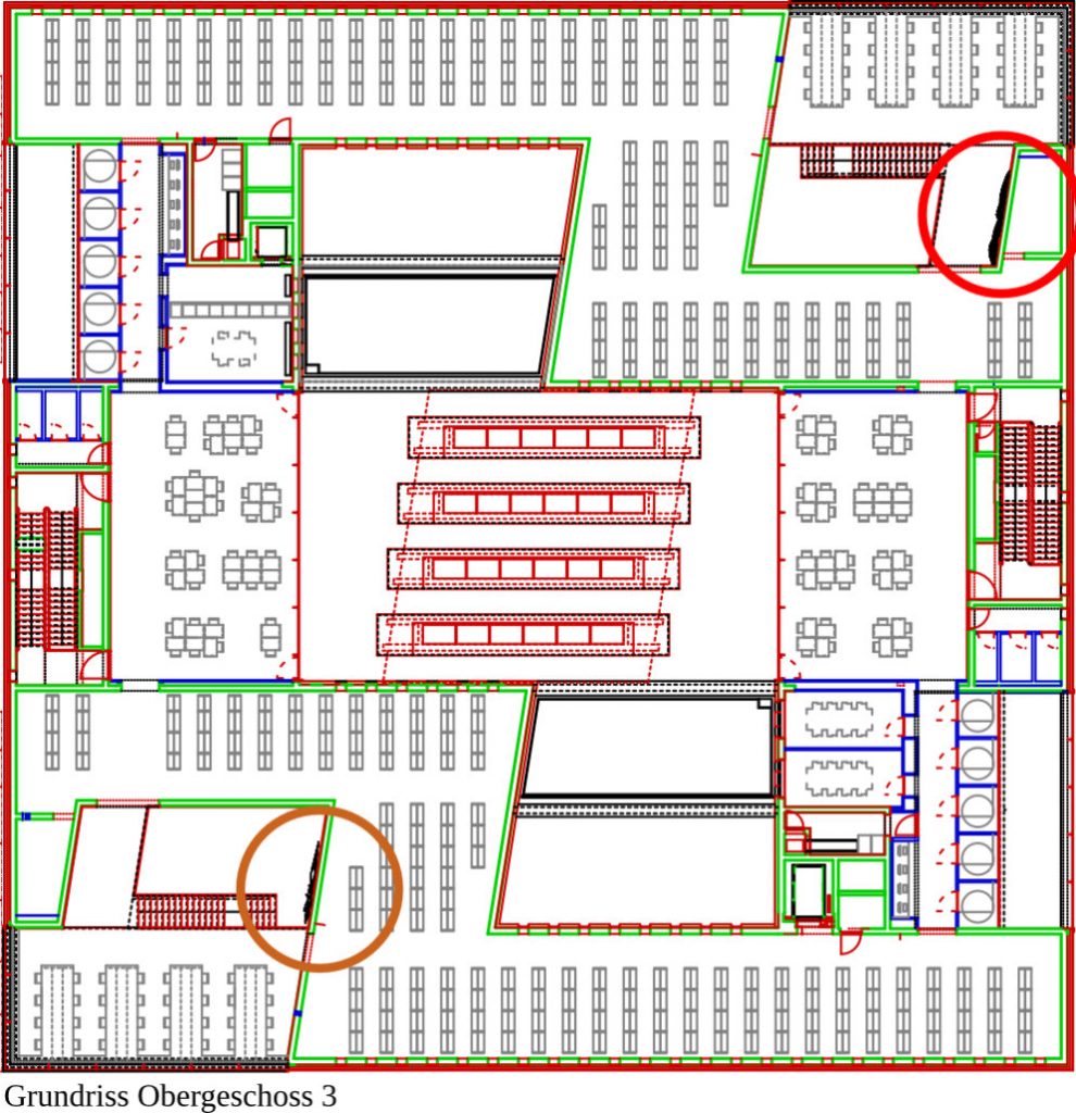 Die Arbeit ordnet dabei den systematischen Zugang dem orangen Treppenhaus zu, letzteren dem roten – sie verbindet das Kühle mit dem Kühlen, das Sinnliche mit dem Sinnlichen. Es werden pro Treppenhaus zwei bzw. drei eng aufeinander bezogene Objekte vorgeschlagen, die sich mit der Wissensaneignung und ihrer sinnlichen Qualität auseinandersetzen.