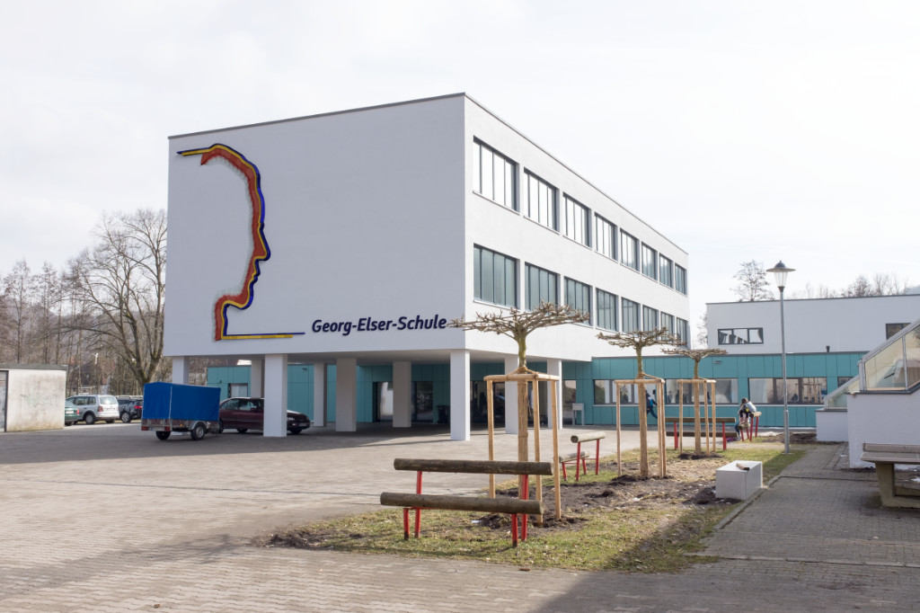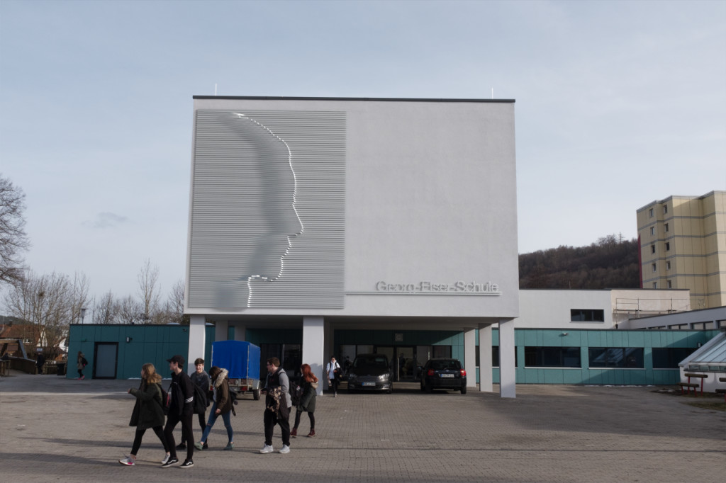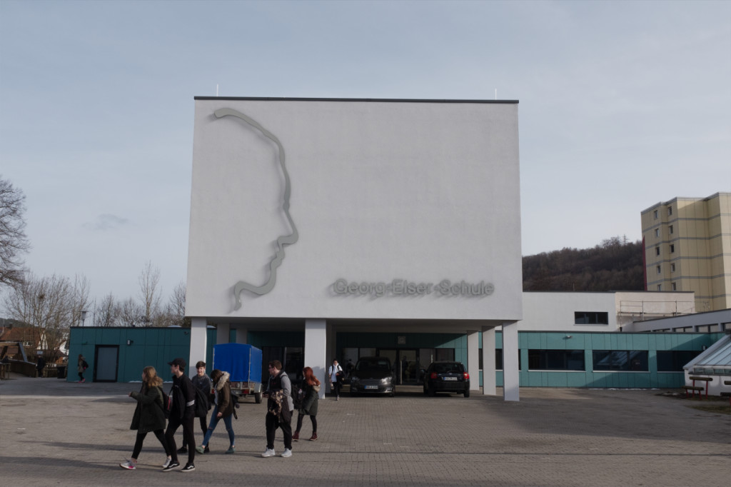 Gleich einer Welle auf einer glatten Wasserfläche wird das Profil von Georg Elser als räumliche Erhebung gebildet. In Abhängigkeit von den Lichtverhältnissen und der Position des Betrachters im Raum wird sich das Gesichtsprofil unterschiedlich einfach erkennen lassen. Der Entwurf gewinnt einen Teil seines Reizes durch die Bewegung des Profils in die Fläche und aus der Fläche heraus. Die streng rechteckige Grundform der Metallfläche wird an einer Stelle aufgelöst um die Grundlinie für den Schriftzug „Georg-Elser-Schule“ zu bilden. Die lineare Linienstärke der Schrift ist aus der Breite der Profilstäbe abgeleitet. - Im dritten wird das Profil von Georg Elser aus Keramikflächen in unterschiedlichen Höhen gebildet und entfaltet dadurch, ergänzt durch Licht und Schatten eine räumliche Gestalt.