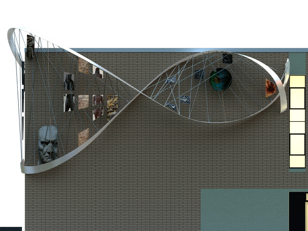 Als konkrete, bildliche Weiterschreibung dieser Analogie wird mit der raumgreifenden Skulptur ein kurzes Bruchstück einer doppelten Helix durch zwei geschwungene Stahlstreifen nachgebildet.