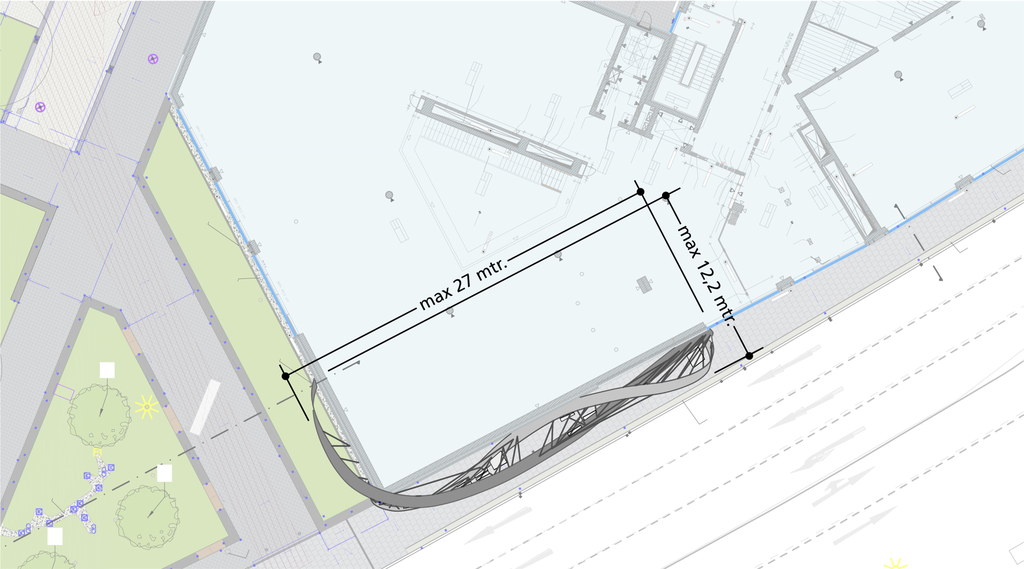 Die beiden Stahlkurvensegmente beginnen etwa an der ersten vertikalen Fensterreihe der nordöstlichen Fassade, schwingen sich zum Teil ein wenig über die Dachkante des Gebäudes und enden an dem großen Fenster der südöstlichen Fassade.